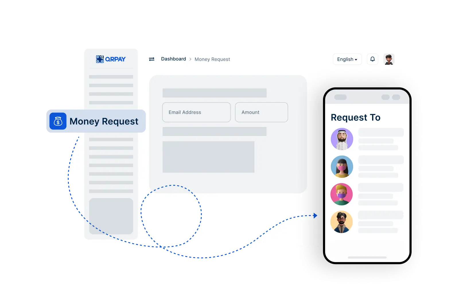 To request money, go to the Request Money feature, enter the recipient's QRPay Pro ID and the amount, then send your request. The recipient will receive a notification to complete the transaction.